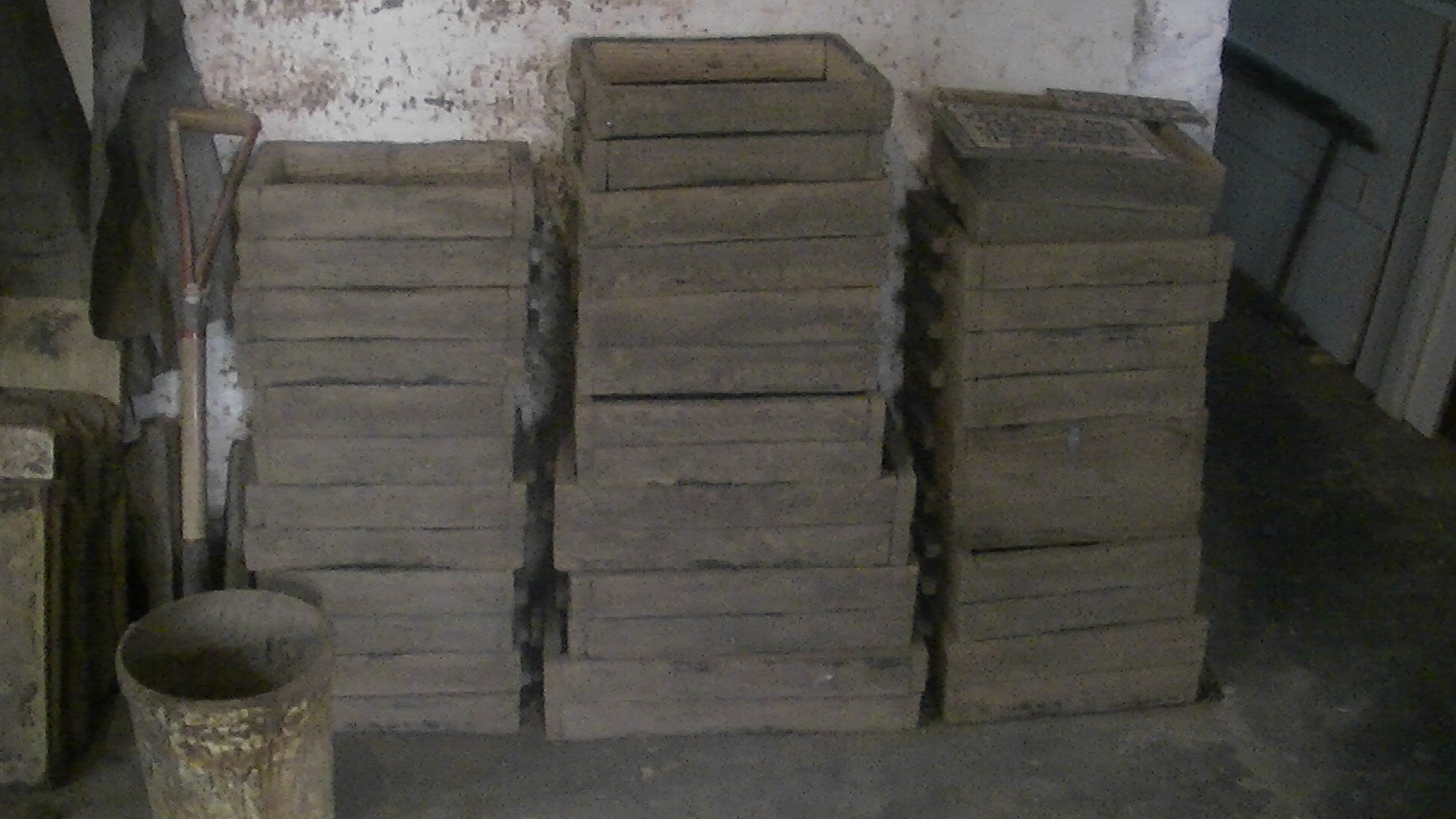 Após isso, usando uma ferramenta de metal manual que tem a forma de uma pá, ele faz então pequenos ajustes nos sulcos laterais e nas letras impressas na “areia”, dando uma espécie de acabamento nas impressões. As fôrmas são então colocadas no chão da oficina, aos pares, uma ao lado da outra. Várias molduras são preparadas deste modo e ficam “descansando” de um dia para o outro, em repouso (Figura 10): “ela precisa ficar descansando pra ela perder um pouquinho da umidade dela, porque senão ela ferve quando a gente coloca o material”.