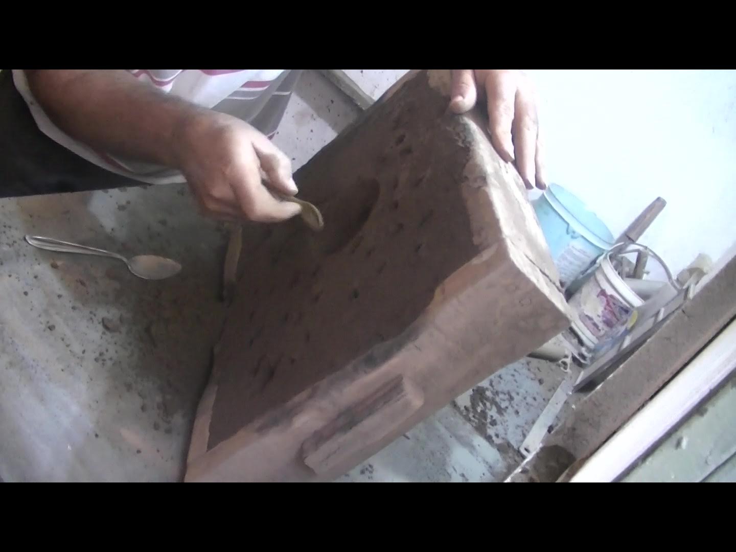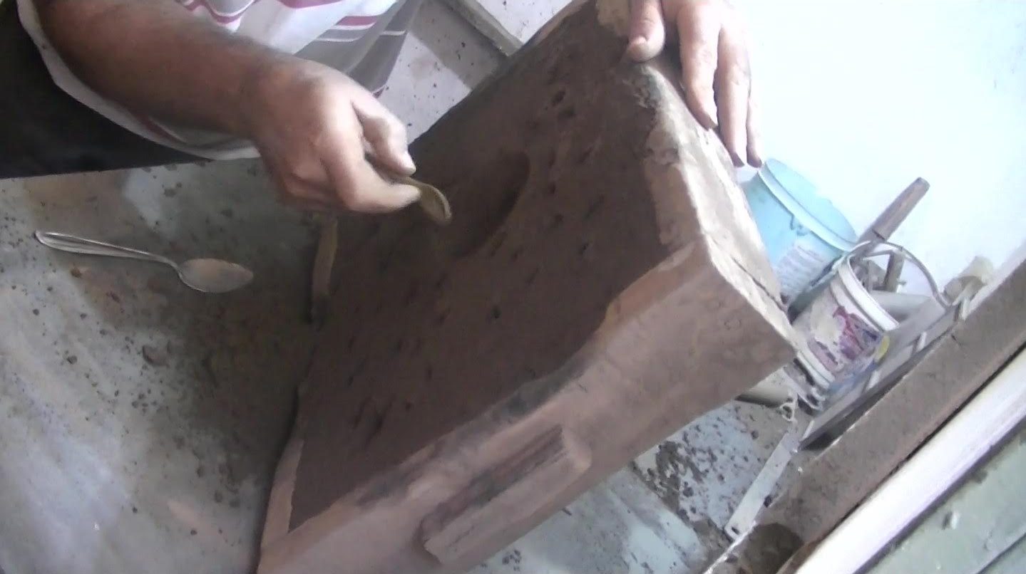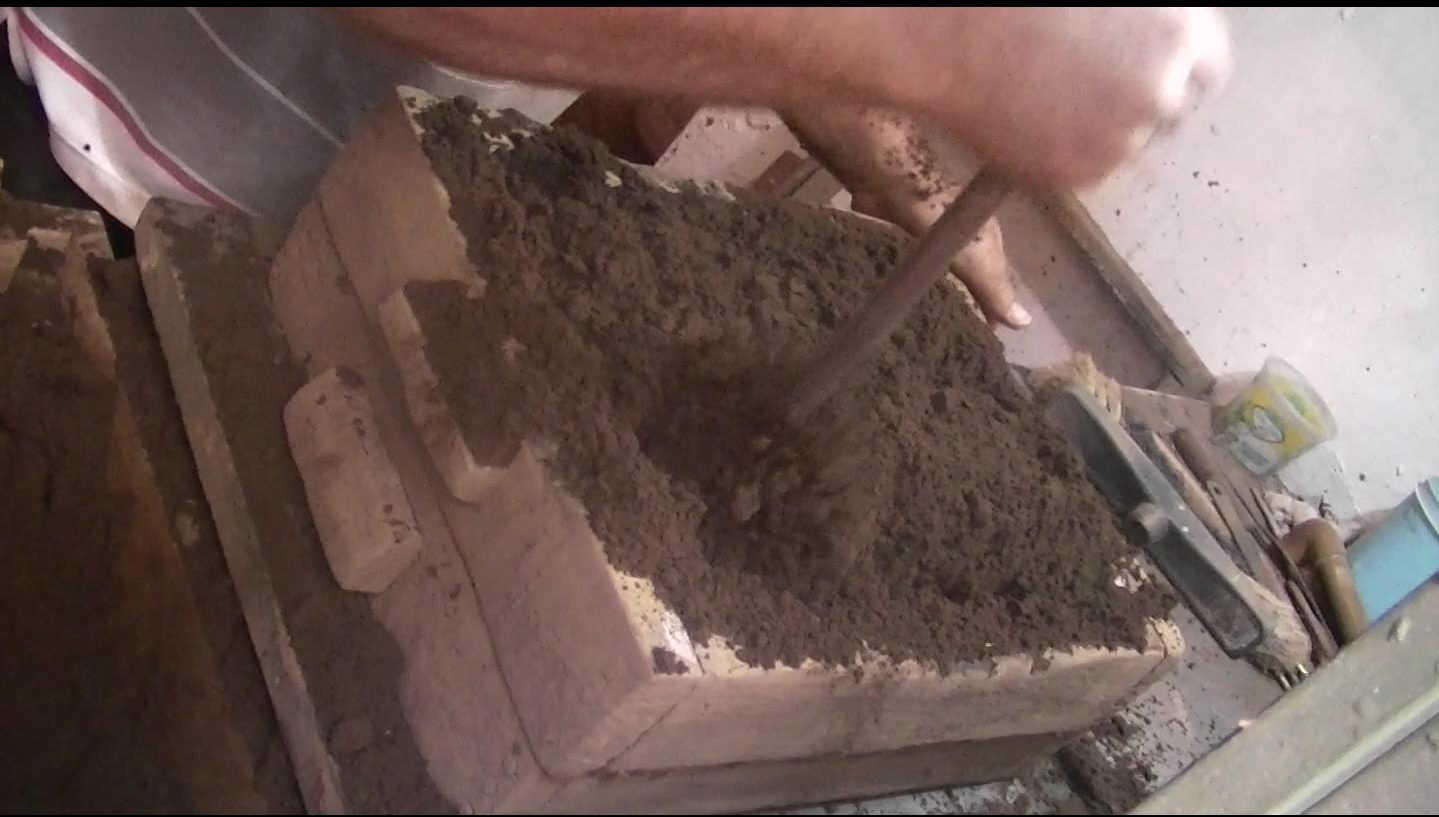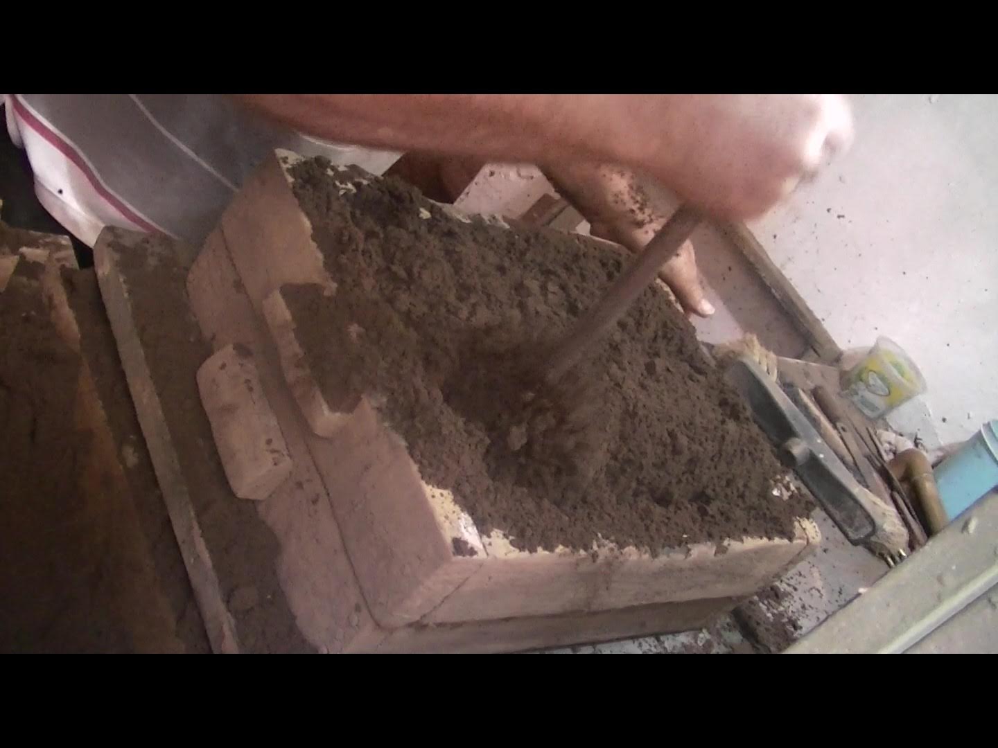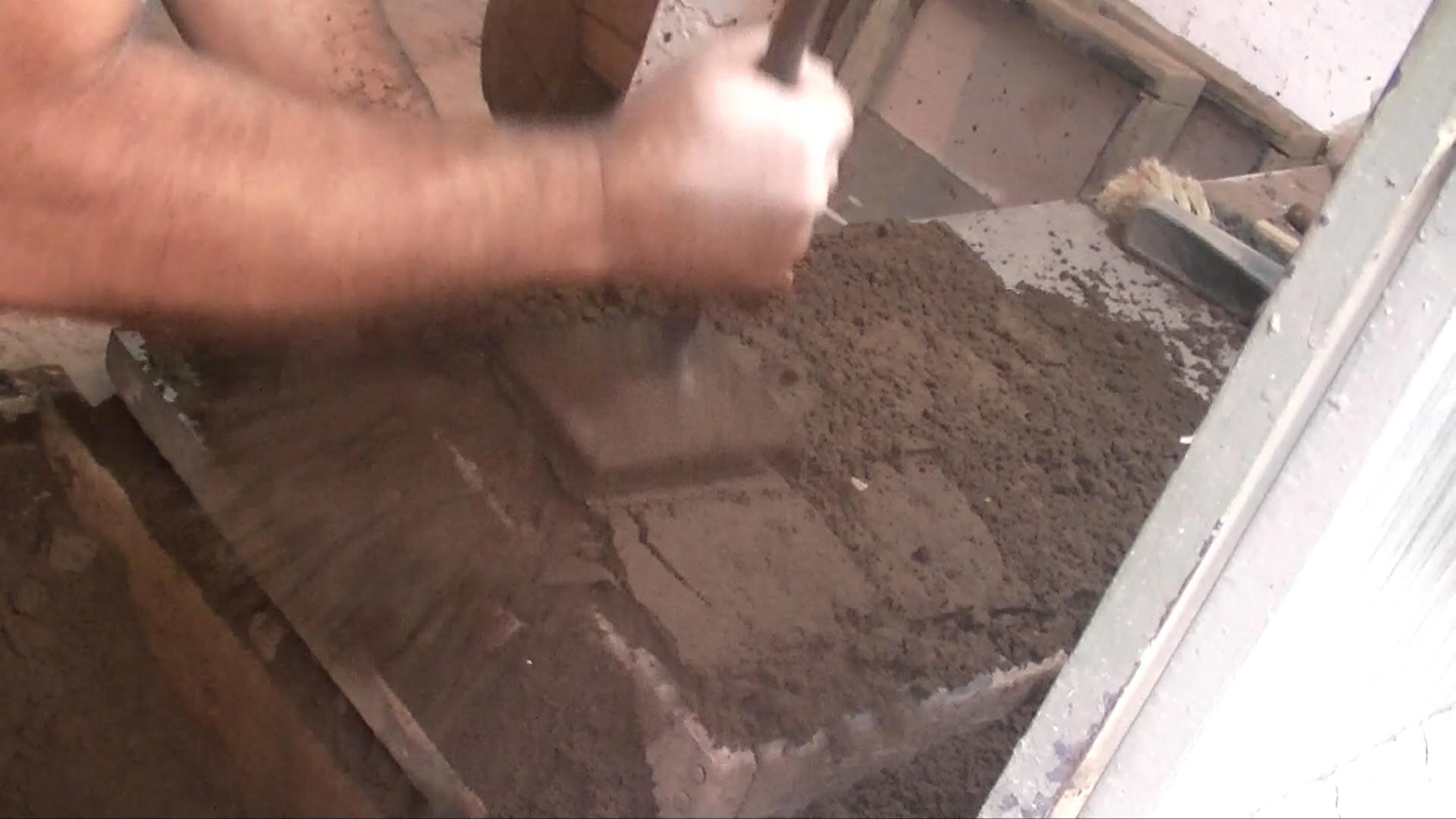 Uma porção de “areia” é colocada dentro da fôrma utilizando uma pá e uma peneira, até cobrir a sua metade. Isto é feito pressionando a “areia” sobre uma peneira colocada acima da moldura com as mãos, a qual sai por baixo mais fina e sem aglomerados, pedras ou impurezas e cai dentro da “fôrma”. Depois, é pressionada dentro da “fôrma” usando um martelo, segurando-o pelo seu cabo e usando a outra extremidade para socar a “areia”. Após isso, mais areia é colocada dentro da fôrma até atingir cerca de um palmo acima de sua altura. Então, utilizando um “soquete feito de ferro e um cano soldado”, a “areia” é pressionada com golpes firmes e enérgicos, para que fique bem compactada (Figura 5).