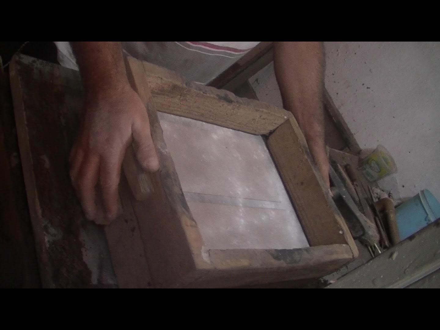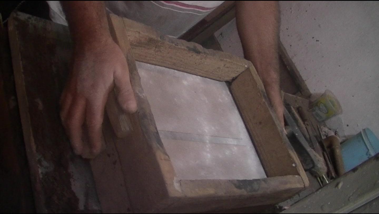 Após “escrever” nos moldes, esses são colocados em uma bancada de alvenaria e posicionados dentro de uma “fôrma” retangular, uma moldura de madeira com saliências laterais para segurá-la com as mãos, como mostra a figura 3. Depois, um pó branco é espalhado sobre os moldes, “é área fina da Serra, serve pra não agarrá a areia no molde”. Cada moldura deste tipo serve para preparar de uma a duas placas por vez e pode ser reutilizada. O Alessandro tem várias.