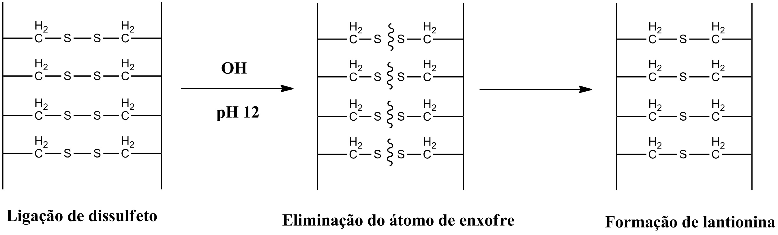 Enquanto observei o processo de luzes realizado pela Joana, ela afirmou: “legal entender a química, né? Igual a do relaxamento, porque ele de química é mais interessante ainda o que ele faz com o cabelo. Ele muda a estrutura do fio. É muito interessante. Já a progressiva não muda não”. Com sua experiência no ramo, o Carlos Alberto explicou: “O relaxamento é mais agressivo. Existe dentro do relaxamento… Normalmente você tem de três a quatro forças de intensidade que você vai usar de acordo com a espessura do fio, né?”. A faixa de pH dos alisadores varia entre 12,5 a 13,3 e o dano causado por estes produtos ao cabelo está, em grande parte, relacionado com isso. Um produto de pH mais baixo, como por exemplo o sulfito de sódio ou bissulfito de amônio (pH 7,6) não alisa o cabelo tão eficazmente como os alisadores alcalinos. Nesses casos, o produto deve ser deixado no cabelo por um longo período de tempo (aproximadamente 50 minutos) para que realmente ocorra o alisamento. Os grupos alcalinos reagem com grupos de cistina produzindo resíduos de lantionina (ROBBINS, 2002, p. 145), como mostra a figura seguinte.