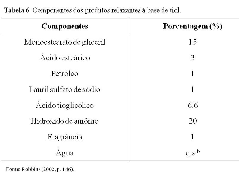 Carlos Alberto então completou: “Vamos supor, você faz um. Hoje o que te incomoda é um cabelo ondulado aí você relaxa ele. Amanhã você quer ficar loira e tem produtos de relaxamento que é incompatível com a descoloração e já esses dois, dependendo da maneira como você trata o cabelo, você pode estar fazendo umas mechinhas que ele aguenta”. Os relaxantes à base de tiol (Tabela 6) geralmente contêm substâncias que ajudam a reconstituir as pontes dissulfeto dos cabelos (ROBBINS, 2002, p. 143-145).